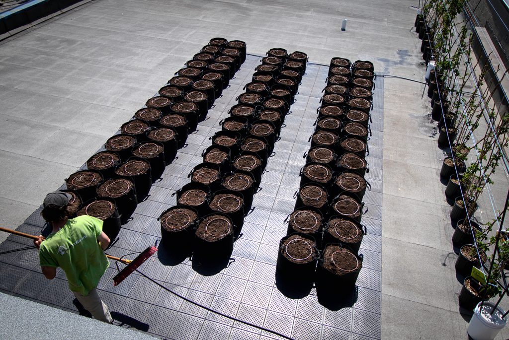 Sur le toit de la succursale limouloise de La Maison Smith, 1200 pieds carrés de surface ont été dédiés en 2020 à la culture potagère dans 78 Smart Pots. Les récoltes étaient destinées en partie aux employé·e·s des six succursales de l’entreprise, et en partie à un organisme communautaire de Limoilou, Le Relais d’Espérance.